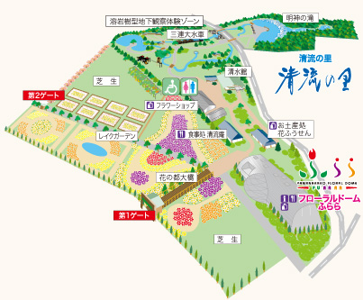 昔なつかしい『三連大水車』。清涼な水を湛える『くじらが池』等水に親しめる施設、花や樹木、大地の息吹きと触れ合う事ができる空間です。
