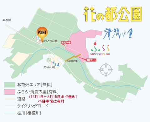 花の都公園有料エリア清流の里では、屋外の水遊具広場や明神の滝、屋内のフローラルドームふららをご利用いただけます。