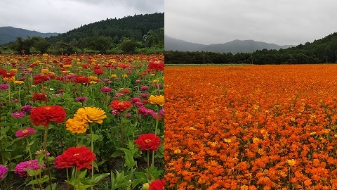 ひまわり7分咲きです。 百日草と黄花コスモスは見頃です。 コスモスも開花してきました。
