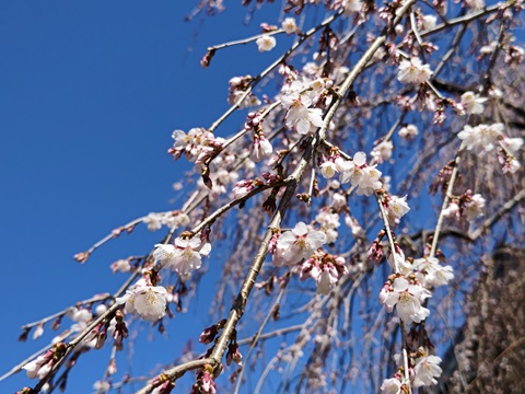 園内で一番早く咲く枝垂桜が開花してきました。 チューリップはまだ先になりそうです。