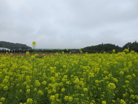 キカラシは、見頃です。 かすみ草・カリフォルニアポピーもだいぶ色付いてきました。 厚い雲の中富士山が少し顔を出しました。