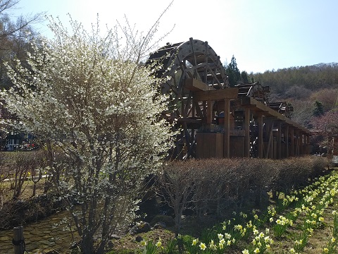 今年は、開花が早くチューリップが咲き始めました。 清流庵横のシダレザクラ・三連大水車横のミドリザクラも見頃です。 ムスカリ・スイセンも咲いてます。 チューリップが見頃になるのは、もう少しです。